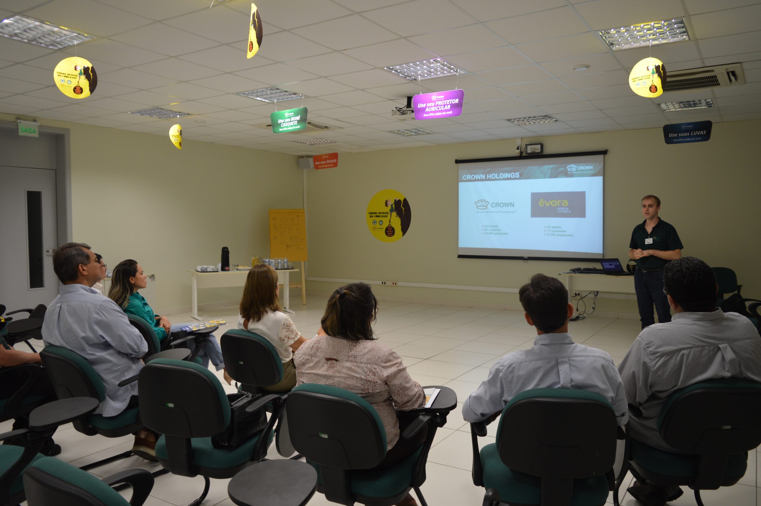 O coordenador de processos industriais da CROWN, Rafael Dworak explanou sobre o funcionamento da empresa, e ao final da visita guiou o grupo para conhecer as dependências da indústria.