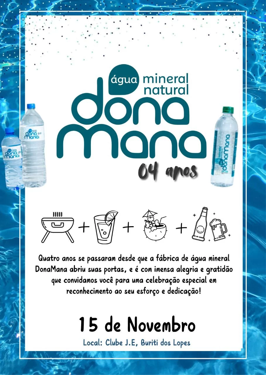 A Fábrica de Água Mineral Donamana está de parabéns! No próximo sábado, 15 de Novembro, a empresa comemora seus 4 anos de existência com uma grande festa para funcionários e convidados no JE Clube de Buriti dos Lopes.