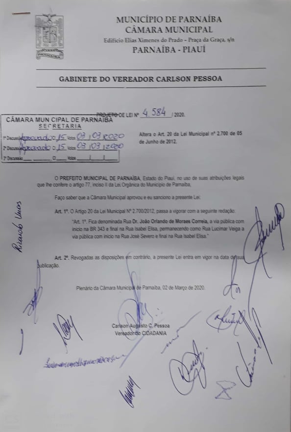 Por fim, no Projeto de Lei de N° 4.584/2020, fica denominada de Rua Dr. João Orlando de Moraes Correia a via pública com início na BR 343 e final na Rua Isabel Elisa. Permanece como Rua Lucimar Veiga a via com início na Rua José Severiano com final na Rua Isabel Elisa.