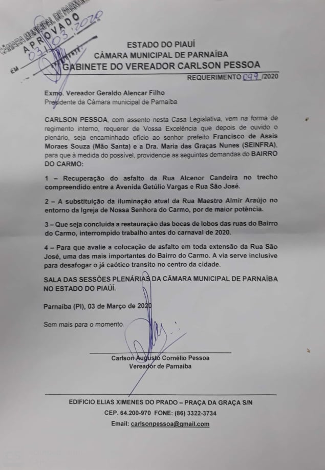 Na sessão ordinária desta terça-feira (03), foram aprovadas importantes matérias de interesse da comunidade de autoria do vereador Carlson Pessoa (Cidadania). No Requerimento de N° 099/2020, são solicitadas várias benfeitorias para o Bairro Nossa Senhora do Carmo, como recuperação do asfalto da Rua Alcenor Candeira, mais precisamente no trecho entre a AV. Getúlio Vargas e Rua São José; substituição da iluminação da Rua Maestro Almir Araújo, no entorno da Igreja Nossa Senhora do Carmo, por lâmpadas mais potentes; conclusão da obra nas bocas de lobo e avaliação de uma possível implantação de pavimentação asfáltica em toda a extensão da Rua São José, uma das mais importantes do bairro. A rua é usada inclusive para desafogar o caótico trânsito no centro de Parnaíba.