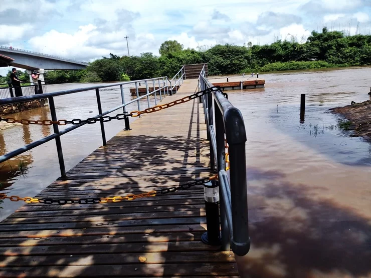 Com a elevação do volume de águas do rio Igaraçu, o píer do Complexo Turístico e Paisagístico Porto das Barcas começou a romper as correntes que seguram a estrutura, por conta da forte correnteza.