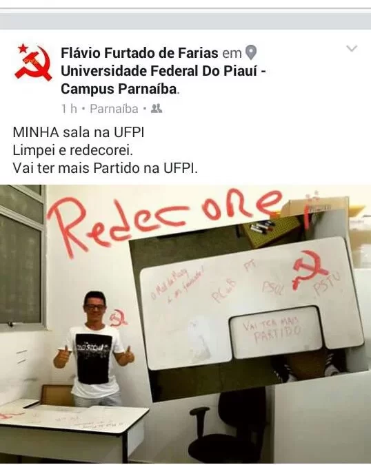 Além do mais em sua página nas redes sociais o autor apenas conhecido por Flávio Furtado de Farias salienta nas pichações que havia redecorado a sala com inscrições de natureza política. “Minha sala de aula na UFPI. Limpei e decorei. Vai ter mais Partido na UFPI”, diz.